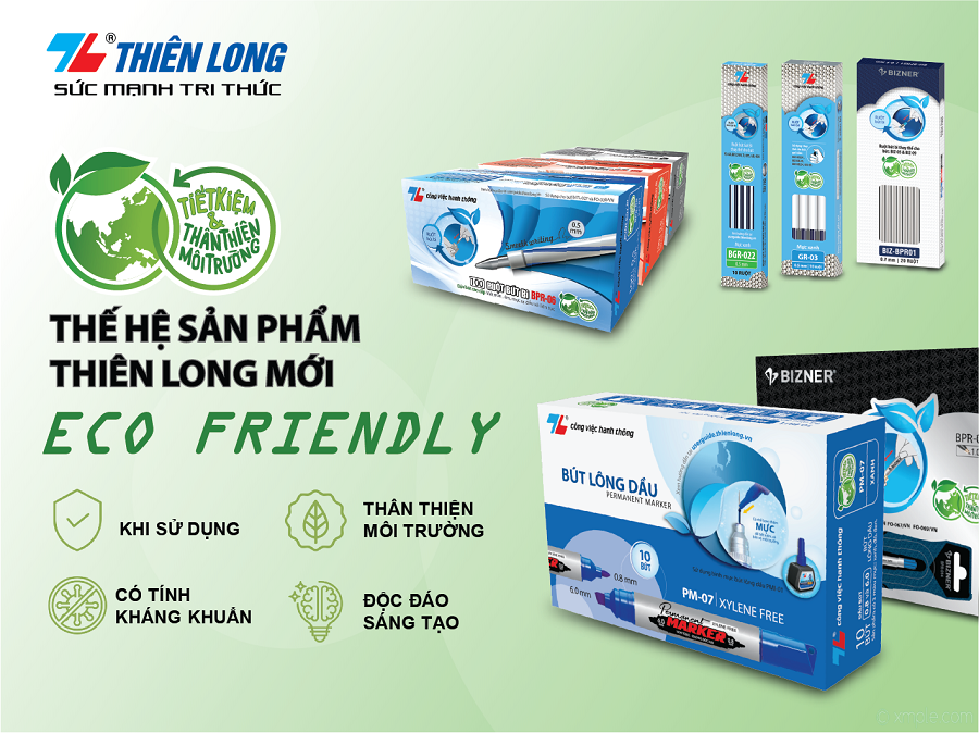 Thế hệ sản phẩm Thiên Long mới – Eco Friendly là nhóm thế hệ sản phẩm thân thiện với môi trường, giúp người sử dụng gia tăng vòng đời sản phẩm, hạn chế số lượng rác thải nhựa trong đời sống hằng ngày. Các sản phẩm này có tính kháng khuẩn, độc đáo sáng tạo và an toàn khi sử dụng.