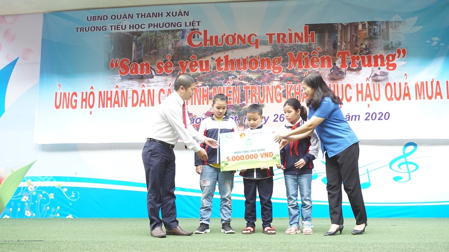 Ông Trịnh Văn Hào và bà Hoàng Tú Anh trao học bổng Vì Mái Trường Xanh cho các em học sinh trường Tiểu học Phương Liệt