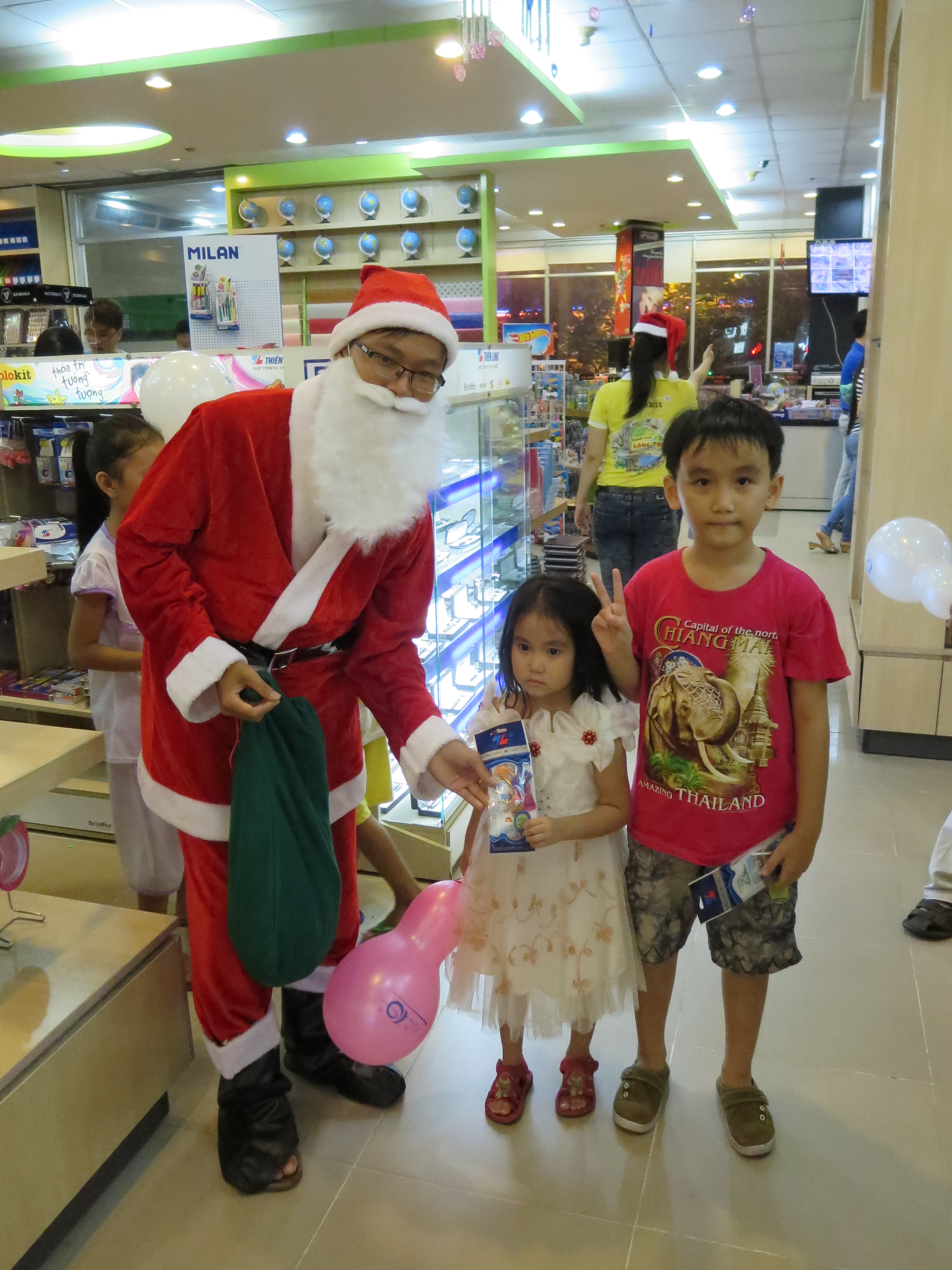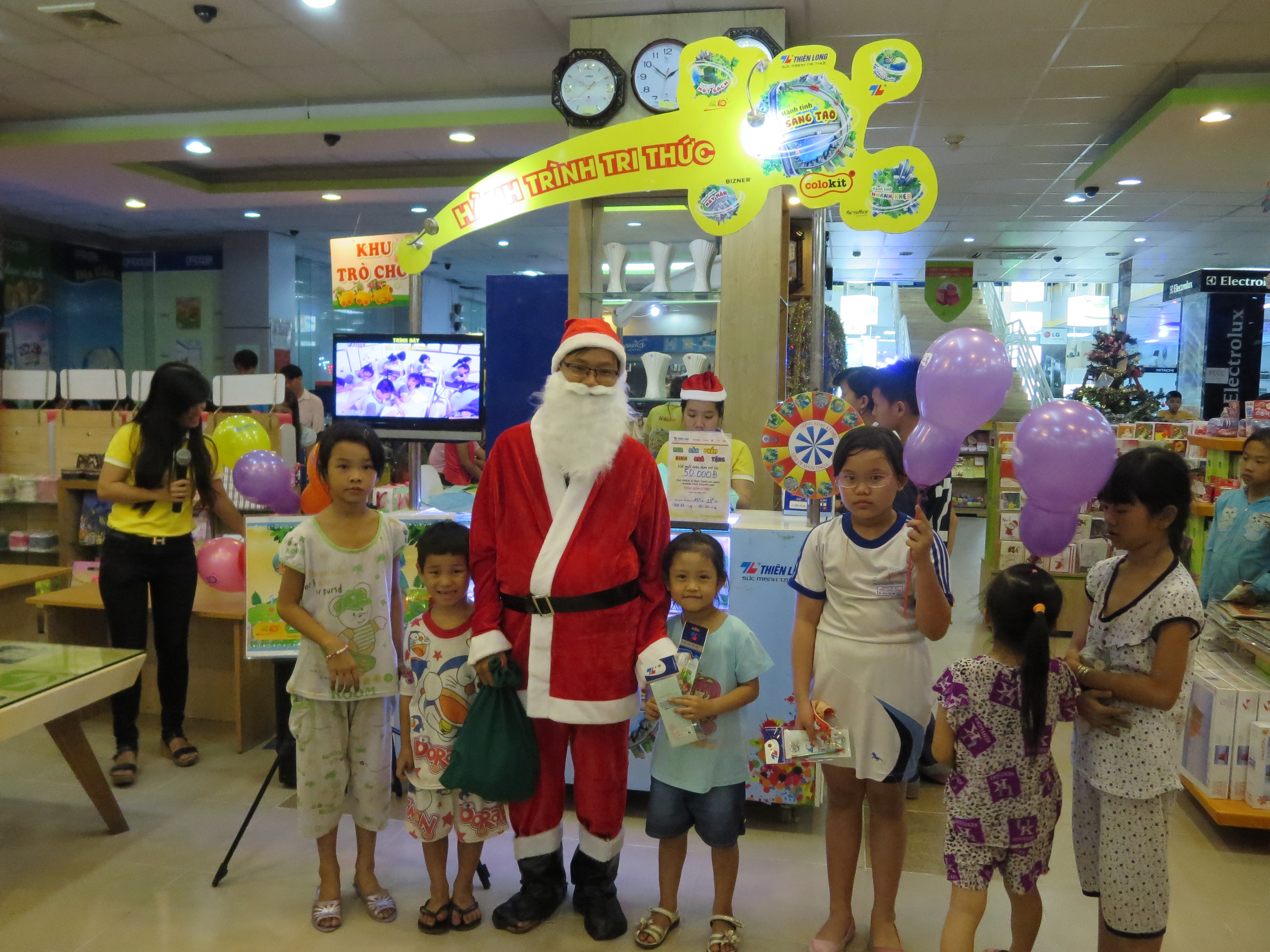 Ông già Noel của chương trình Hành Trình Tri Thức tặng quà may mắn cho các em nhỏ tại siêu thị, nhà sách.