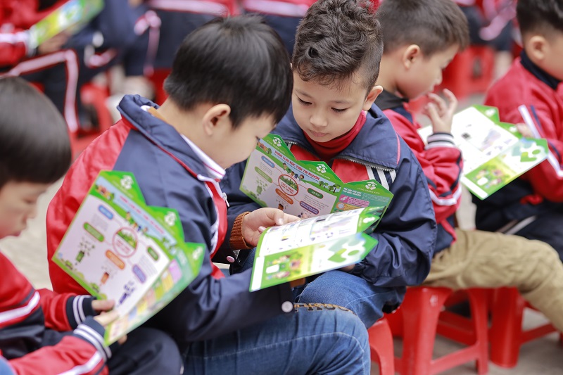 Các em chăm chú tìm hiểu thông tin hướng dẫn trên tờ cẩm nang để có thể áp dụng đúng nhất kiến thức phân loại rác thải trong trường của mình