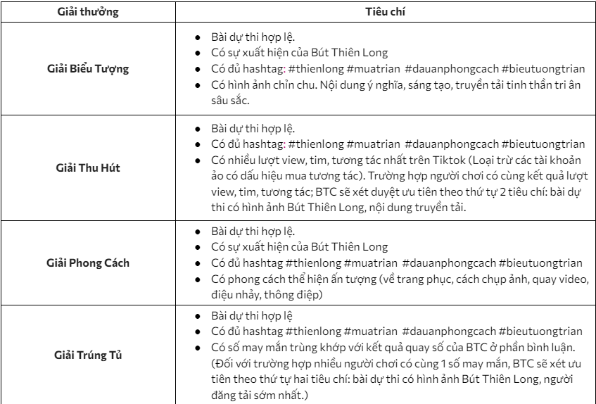 - Các giải Biểu Tượng và Phong Cách chỉ được lựa chọn trên clip có sự xuất hiện của Bút Thiên Long. Đối với những bài dự thi không yêu cầu, hình ảnh Bút Thiên Long trong video là một điểm cộng.