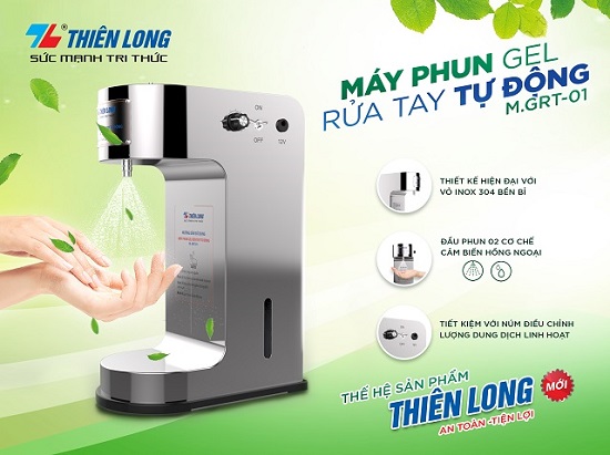 Vào quý 2/2020, Thiên Long sẽ lần đầu tiên cho ra mắt mẫu Máy phun gel rửa tay tự động (Mã sản phẩm M.GRT-01). Máy có thiết kế hiện đại, sang trọng với bề mặt kim loại sáng bóng, sạch sẽ tạo thiện cảm với người sử dụng. Trọng lượng máy chắc chắn với 2.6 kg. Dung tích bình chứa gel lên tới 850 ml đảm bảo cung cấp đủ và liên tục lượng gel rửa tay cần thiết tại nơi công cộng. Để tăng sự linh hoạt trong bài trí, thiết bị này còn được thiết kế sẵn lỗ treo tường giúp tiết kiệm tối đa diện tích.