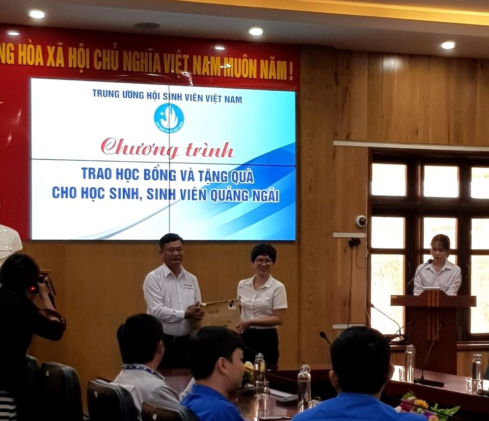 Đại diện tập đoàn Thiên Long (bên trái) trao tặng phần quà cho Huyện đoàn Sơn Hà (Quảng Ngãi) để gửi đến các em học sinh miền núi dân tộc thiểu số
