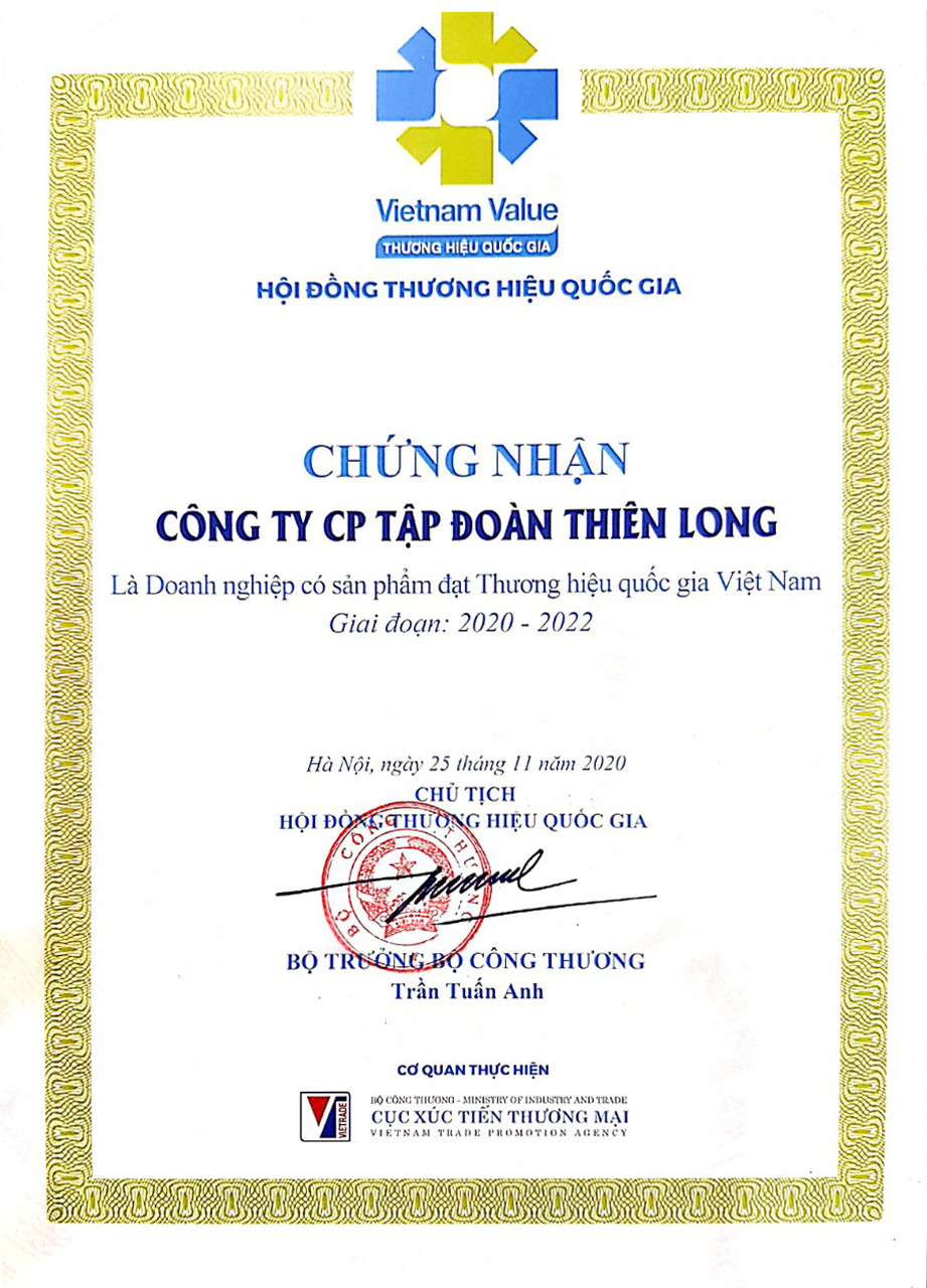 Năm 2020 là năm thứ 3 liên tiếp tập đoàn Thiên Long được vinh danh trong danh sách Thương hiệu quốc gia. Để đạt được thành tựu này, tập đoàn Thiên Long đã đáp ứng được những tiêu chí xét chọn khắt khe từ phía Ban tổ chức, chứng minh được năng lực sản xuất kinh doanh và có nhiều đóng góp cho cộng đồng và xã hội.