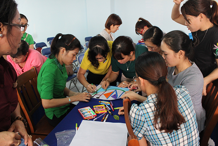 Thạc sĩ Lê Thị Liên Hoan hướng dẫn các giáo viên mầm non tạo hình sáng tạo.