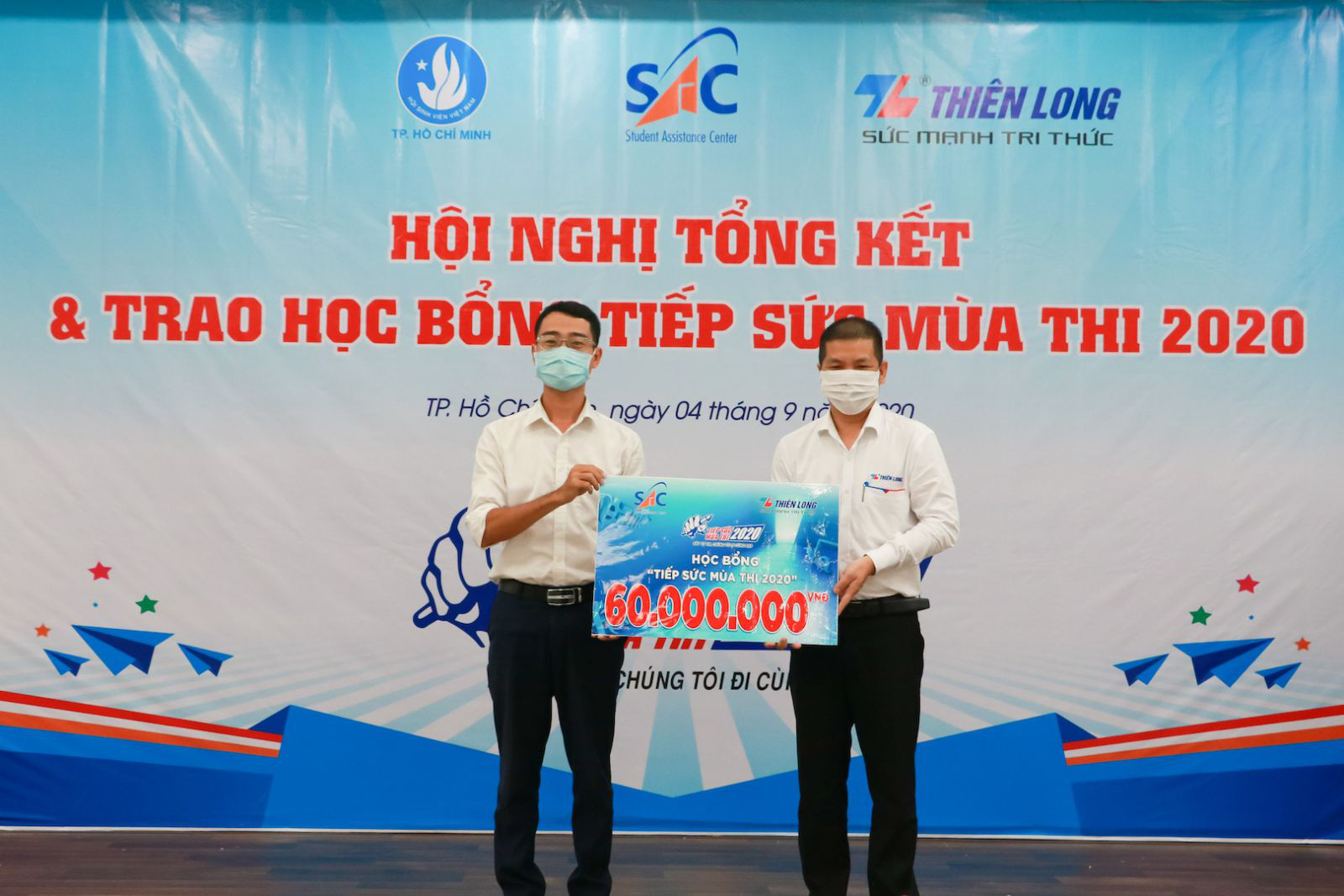 Ông Trinh Văn Hào (bên phải) đại diện tập đoàn Thiên Long trao tượng trưng 30 suất học bổng tại lễ tổng kết cho đại diện trung tâm hỗ trợ học sinh, sinh viên TPHCM (SAC)