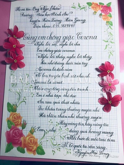 Bài viết: Cùng em chống giặc Corona (em Ong Ngọc Châu, lớp 2 Trường TH Bình An, huyện Kiên Lương, tỉnh Kiên Giang) gây ấn tượng với nét chữ “đẹp như in” cùng những cánh hoa thơm ngát điểm tô.