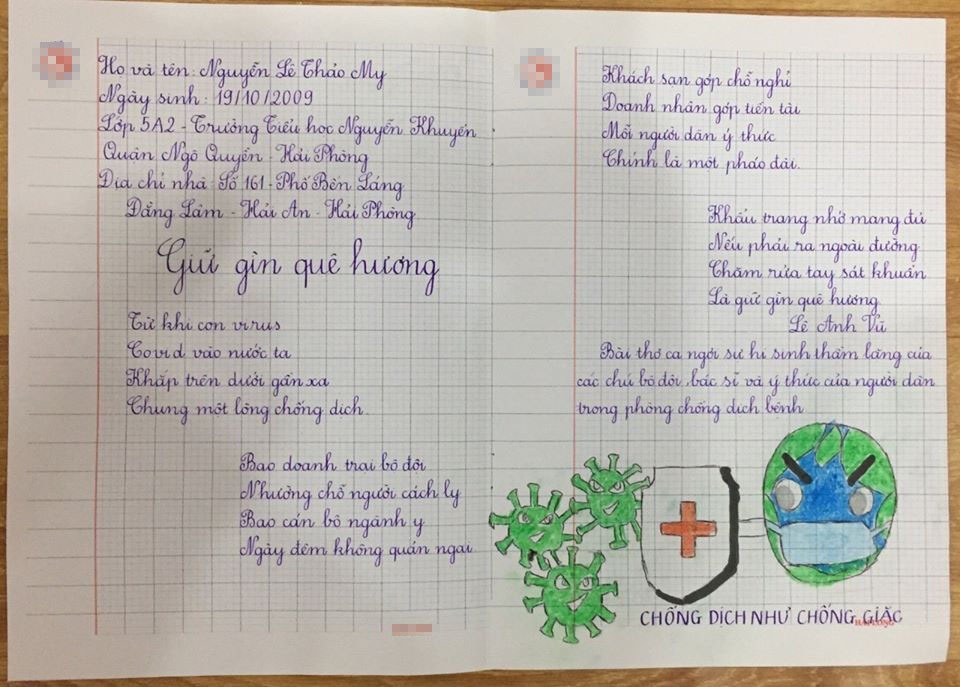 Bài viết: Giữ gìn quê hương (em Nguyễn Lê Thảo My, lớp 5A2 Trường TH Nguyễn Khuyến, quận Ngô Quyền, thành phố Hải Phòng) đầy cảm hứng với slogan “quốc dân” – chống dịch như chống giặc