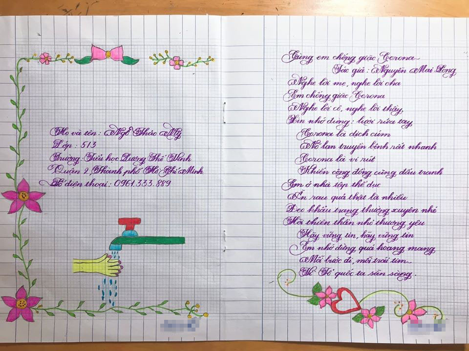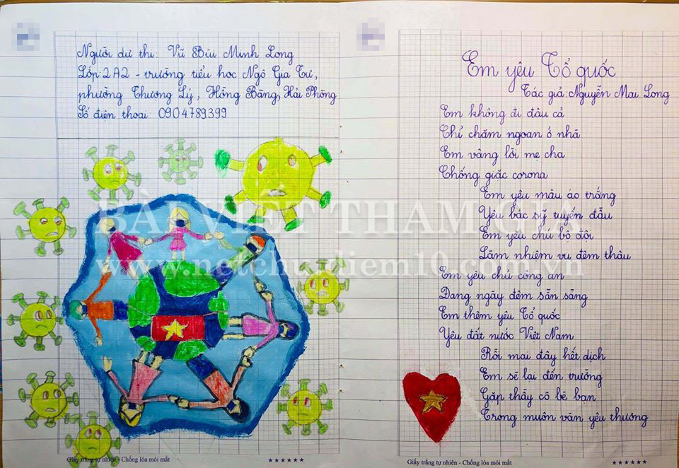 Không chỉ “gửi hết tâm tình vào từng câu chữ” bằng những bài thơ ý nghĩa trong công cuộc đấu tranh với dịch Covid-19 như “Em yêu Tổ quốc”; “Hẹn với mái trường”; “Giữ gìn quê hương”... Các em còn sáng tạo với những nét vẽ xinh xắn. Đơn cử như bài viết của em Vũ Bùi Minh Long.