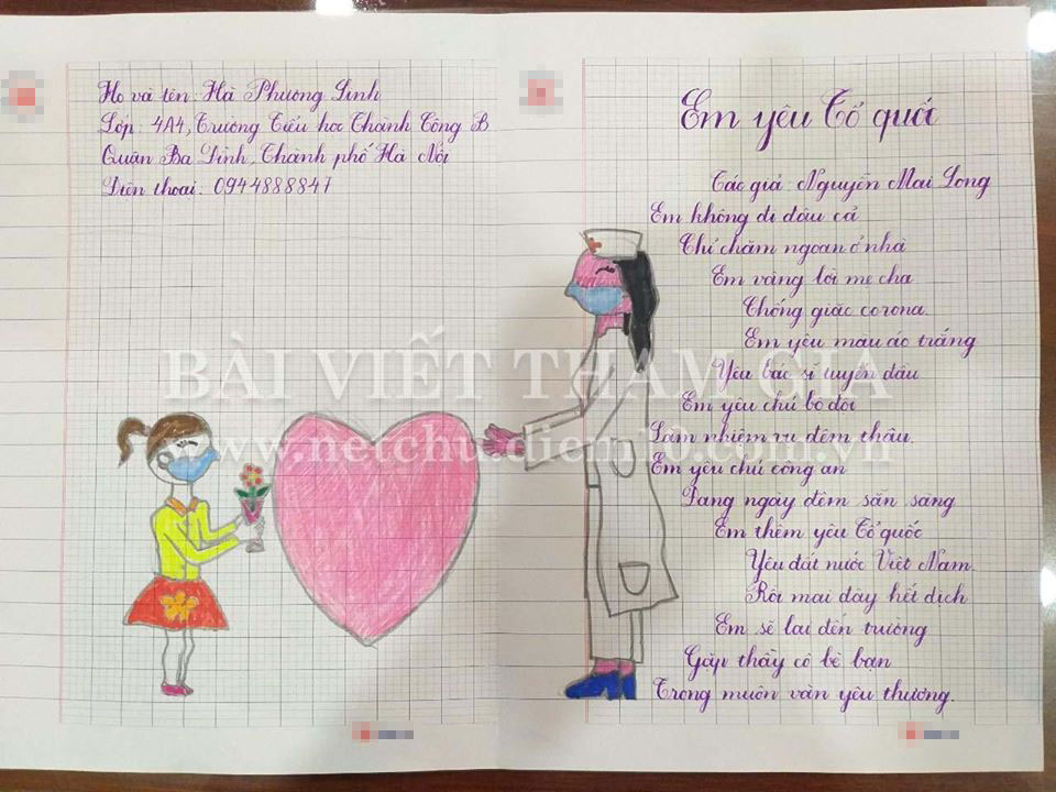 Bài viết: Em yêu Tổ quốc (em Hà Phương Linh, lớp 4A4 Trường TH Thành Công B, quận Ba Đình, thành phố Hà Nội) thể hiện tình yêu và lòng biết ơn với các “thiên thần áo trắng”