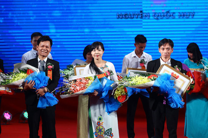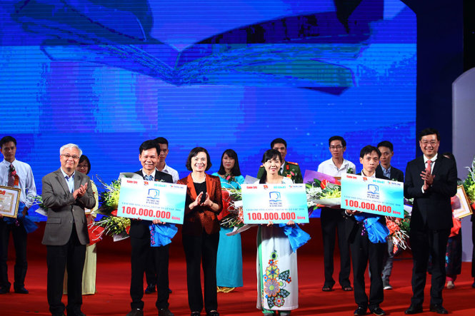 Ba tác giả và nhóm tác giả có các công trình xuất sắc nhất tại lễ trao giải chương trình "Tri thức trẻ vì giáo dục" năm 2016 - Ảnh: NGUYỄN KHÁNH