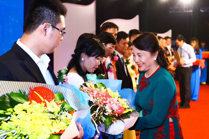 Bà Nguyễn Thị Nghĩa, thứ trưởng Bộ GD&ĐT tặng hoa cho các tác giả lọt vào vòng chung kết giải thưởng "Tri thức trẻ vì giáo dục" năm 2016 - Ảnh: NGUYỄN KHÁNH