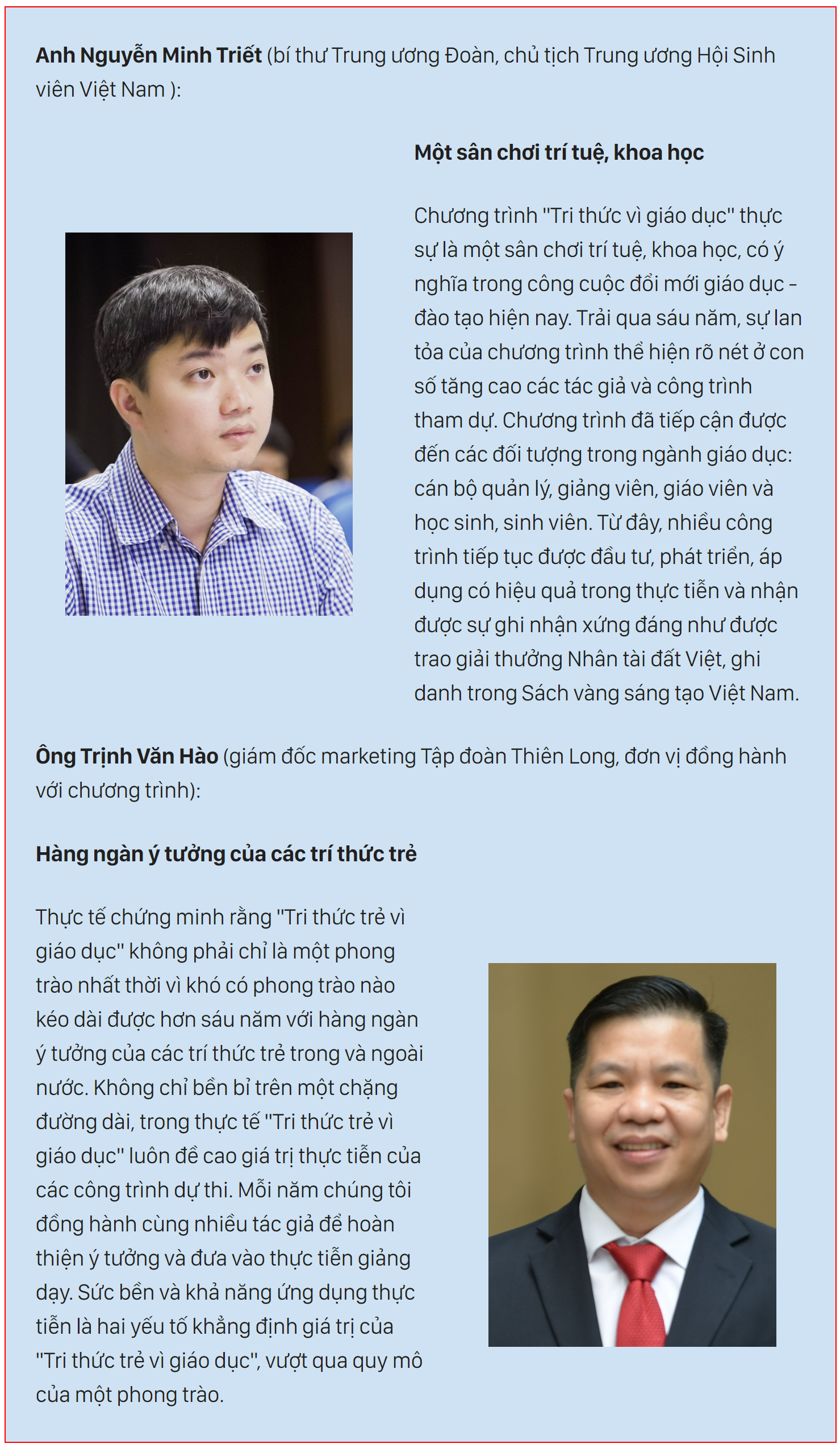 TS Nguyễn Quân - nguyên bộ trưởng Bộ Khoa học và công nghệ, trưởng ban giám khảo chương trình "Tri thức trẻ vì giáo dục" - chia sẻ: "So với thời kỳ đầu, số lượng và chất lượng công trình tham gia ngày càng tăng. Không chỉ có hàm lượng khoa học mà cả tính ứng dụng, thương mại hóa cũng cao hơn. Hai năm đại dịch COVID-19 cho thấy có nhiều thách thức trong việc ứng dụng công nghệ vào các lĩnh vực đời sống và giáo dục nói riêng. Trong các công trình được chọn vào chung khảo, có nhiều công trình ứng dụng công nghệ thông tin, tích hợp được các nền tảng công nghệ số. Đây là những sản phẩm hữu ích trong bối cảnh hiện nay".