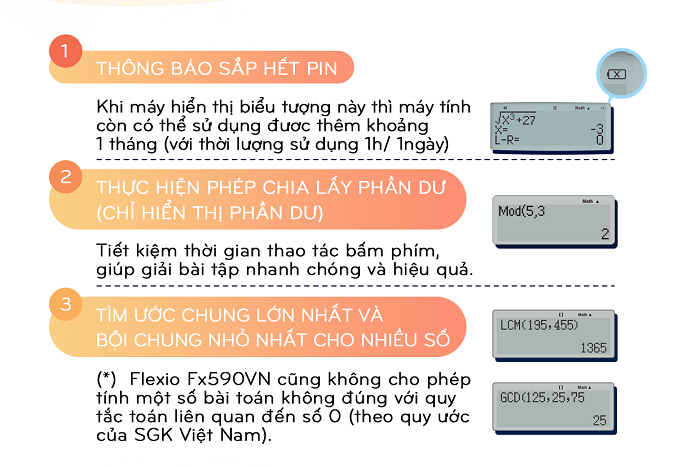 Bên cạnh 453 tính năng sẵn có, máy được bổ sung thêm 02 tính năng mới mà chưa một máy tính nào trên thị trường có được. Đó là tính năng Thông báo sắp hết pin và tính năng Thực hiện phép chia lấy phần dư (Mod - Chỉ hiển thị phần dư). Ngoài ra, tính năng tìm ƯCLN và BCNN được phát triển hơn với việc Fx590VN có thể tính ƯCLN và BCNN cho nhiều số.