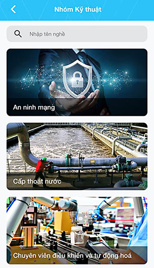 Giao diện thân thiện của một trong các nhóm ngành nghề ứng dụng JobWay.