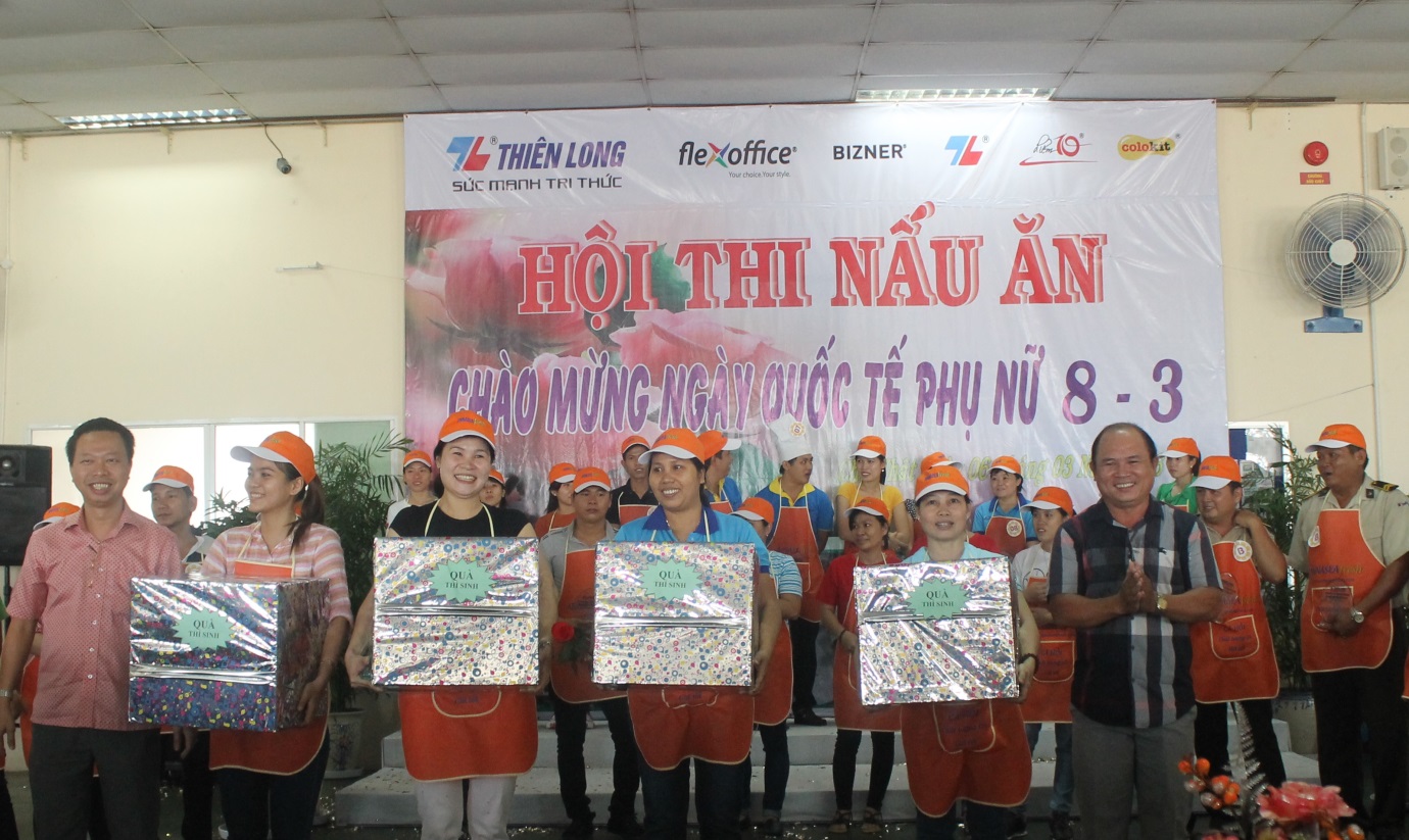Chủ Nhật ngày 6 tháng 3 vừa qua, Tập đoàn Thiên Long cũng đã tổ chức Hội thi nấu ăn mừng ngày Quốc tế Phụ nữ 8/3 với chủ đề “Bữa cơm gia đình” dành cho các công nhân trong công ty. Cuộc thi diễn ra sôi nổi với nhiều phần thưởng hấp dẫn và mong muốn cho các bạn nữ trong công ty có một ngày lễ thật ý nghĩa. |