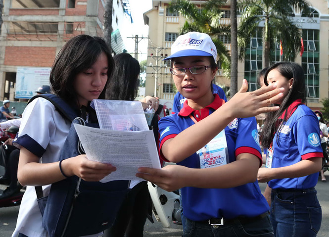 Tình nguyện viên TP.HCM chỉ dẫn đường đi cho thí sinh.